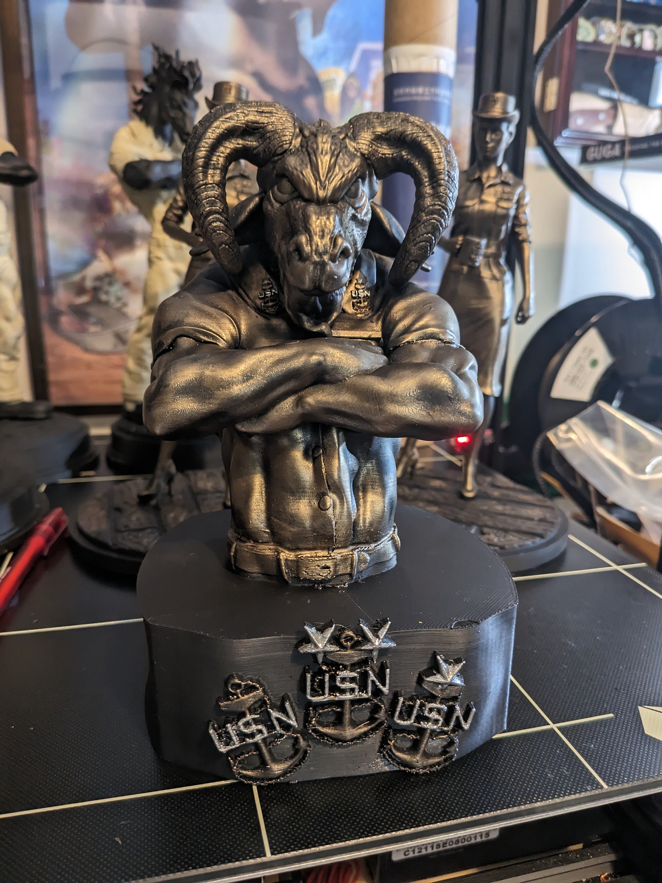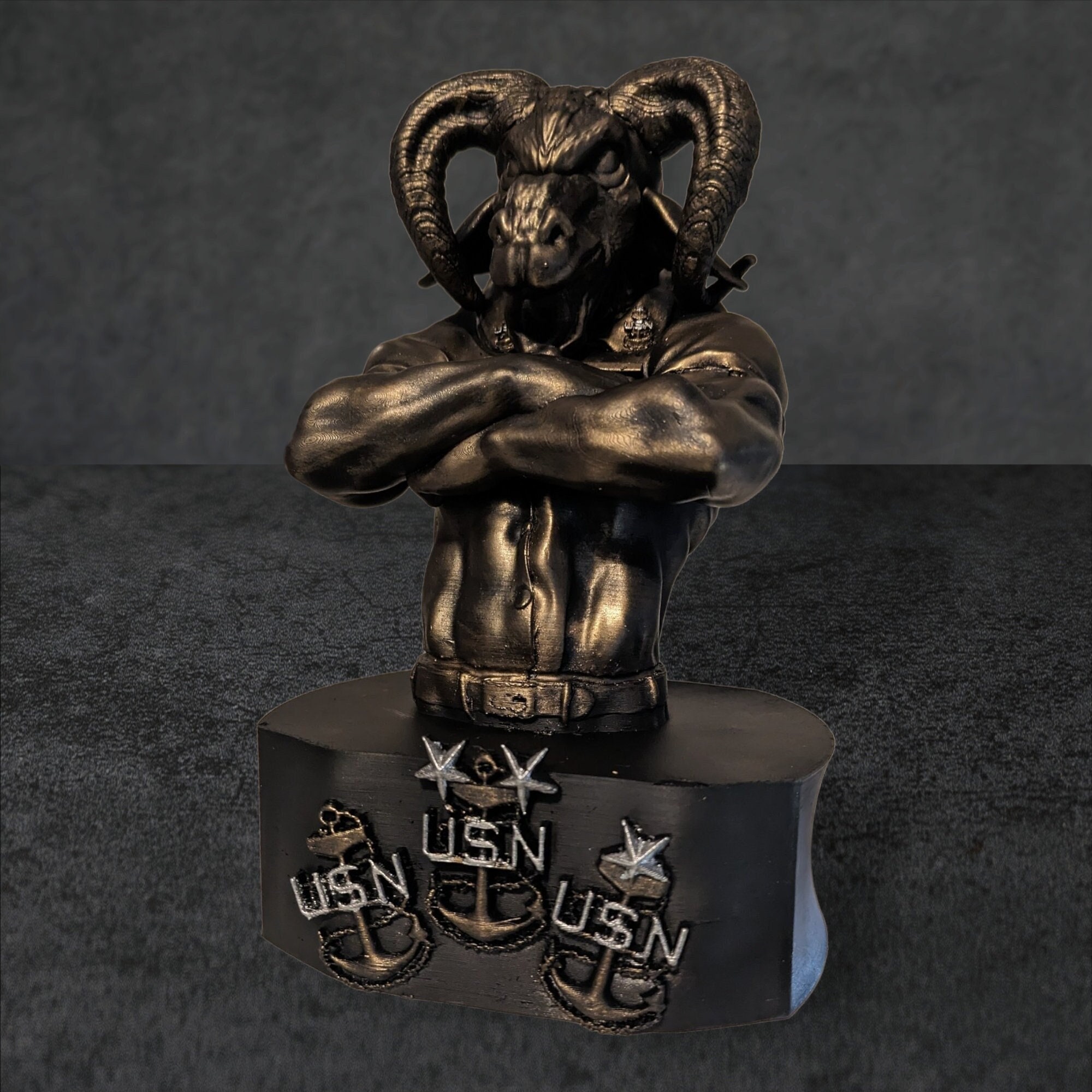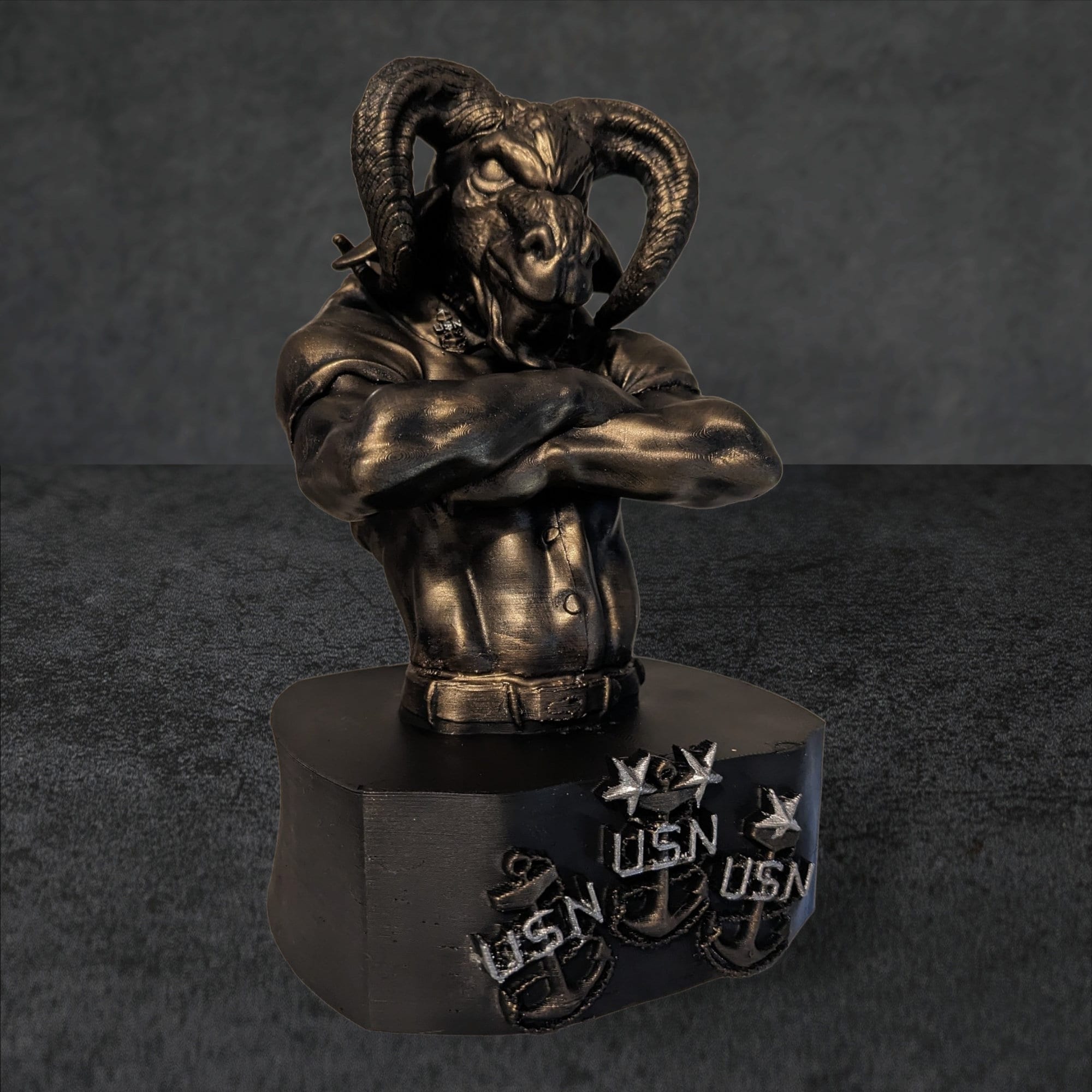 We present to you a unique statue for our Goat Father Bust. This statue is only available in a bronze statue tone. Stands around 7+ inches tall. The only personalization available is for the Rank on the collar Devices and one warfare Device. You can have the option to include a laser engraved plaque (limit to 2 lines of script with up to 34 characters including spaces.